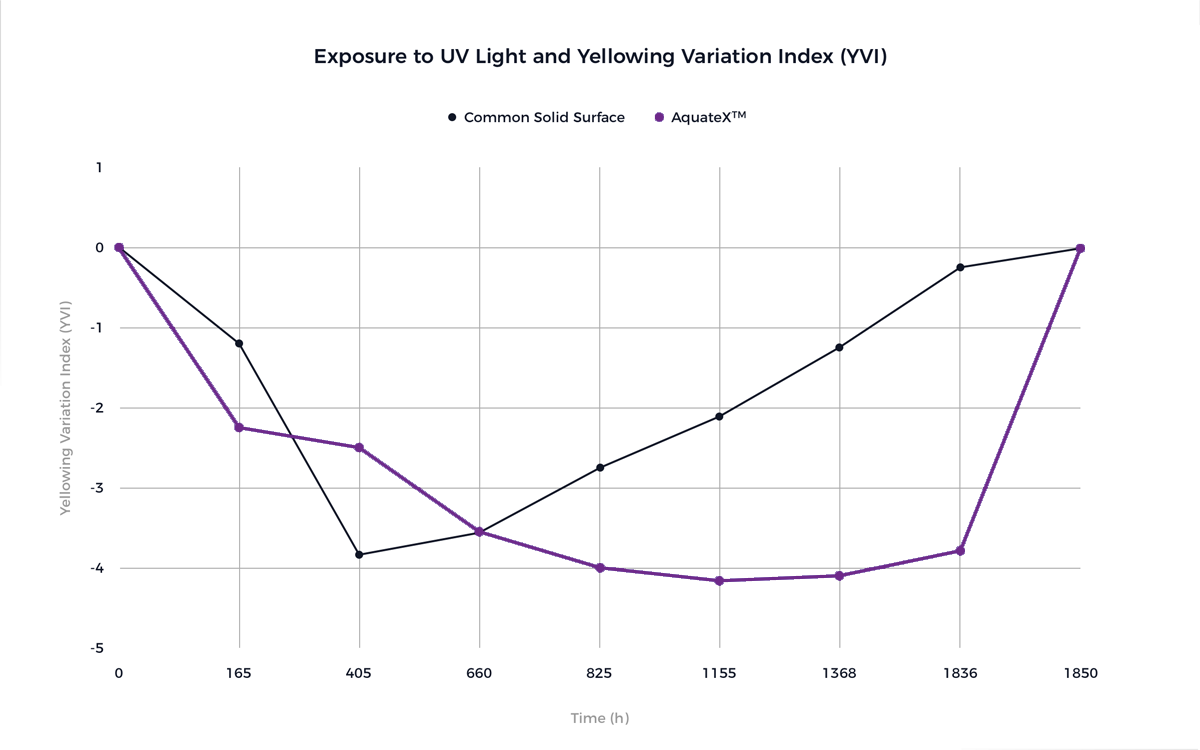 Unlike most other commercially available Solid Surfaces, AquateX™ is extremely resistant to yellowing or aging (the progressive color variation that the product undergoes over time). This is a very important difference which can be explained as follows.
