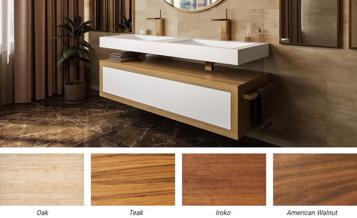 Renowned for its natural beauty and durability, solid wood is considered the perfect choice for luxury bathrooms. Aquatica selected solid wood as it offers an exquisite appearance, achieving a lovely patina as it ages. The rich wooden tones and smooth finish of the wood add a natural earthy touch to bathrooms. Solid wood can compliment a wide range of styles from contemporary to rustic. Aquatica offers a diverse array of carefully crafted wooden sink vanities and stylish bathroom accessories made of high-quality solid wood. Available to buy in six different species of wood, including Teak, American Walnut and Iroko, our solid wood furniture will complete your beautiful bathroom decor.
