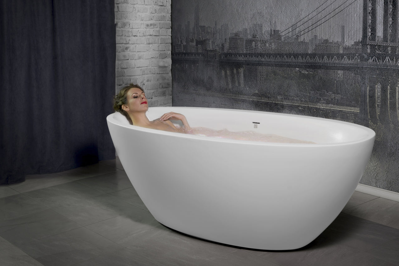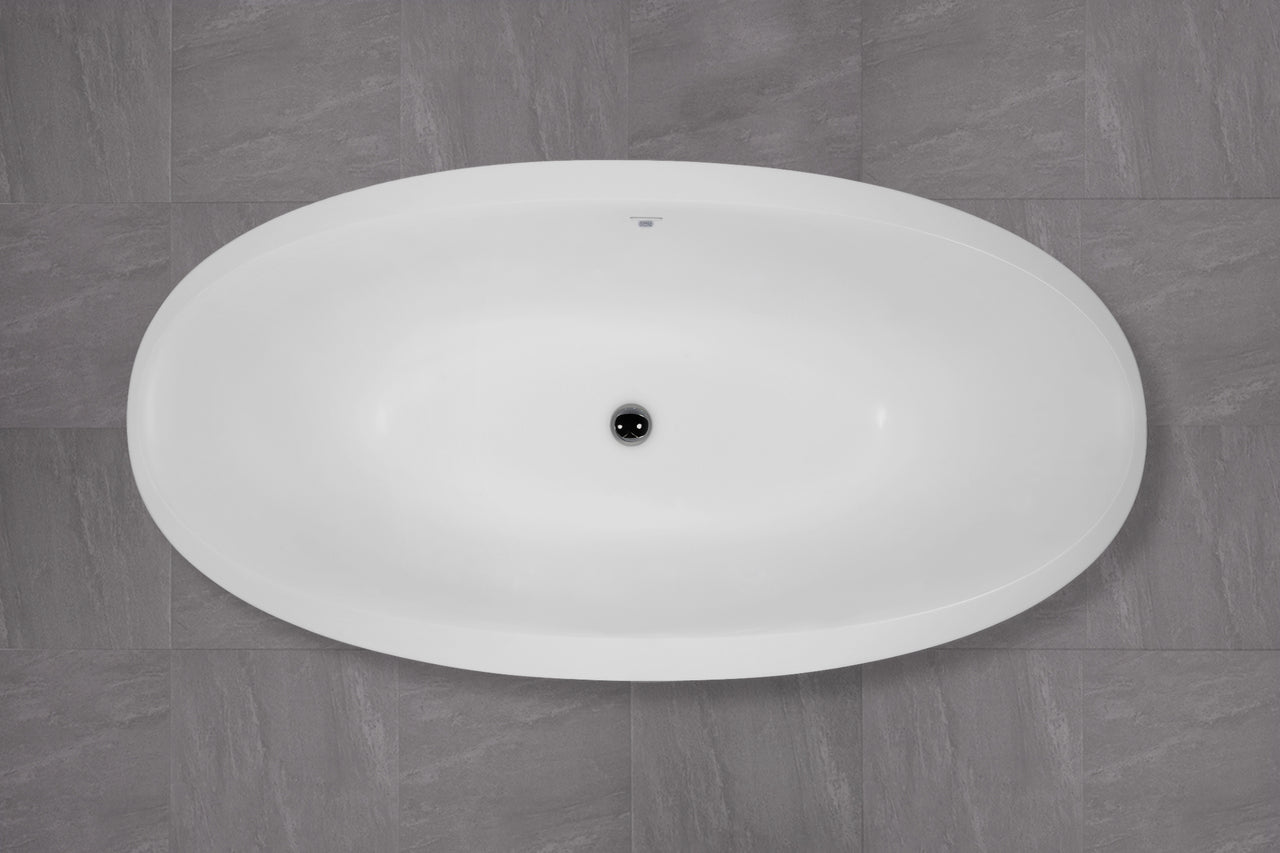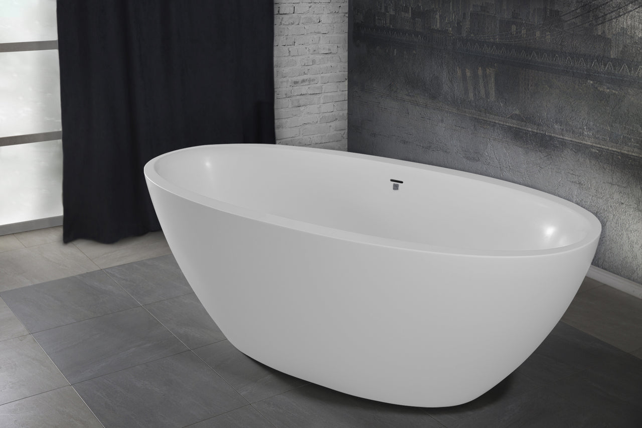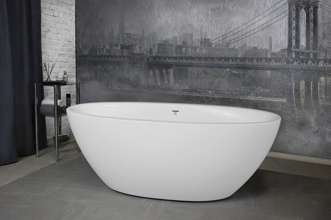 - Freestanding solid surface bathtub designed for space-conscious bathrooms