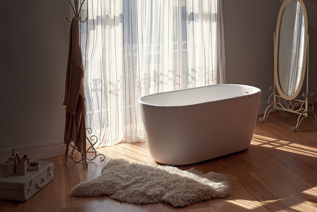 It is designed for small bathrooms, condos, and urban spaces where a compact freestanding bathtub is preferred.