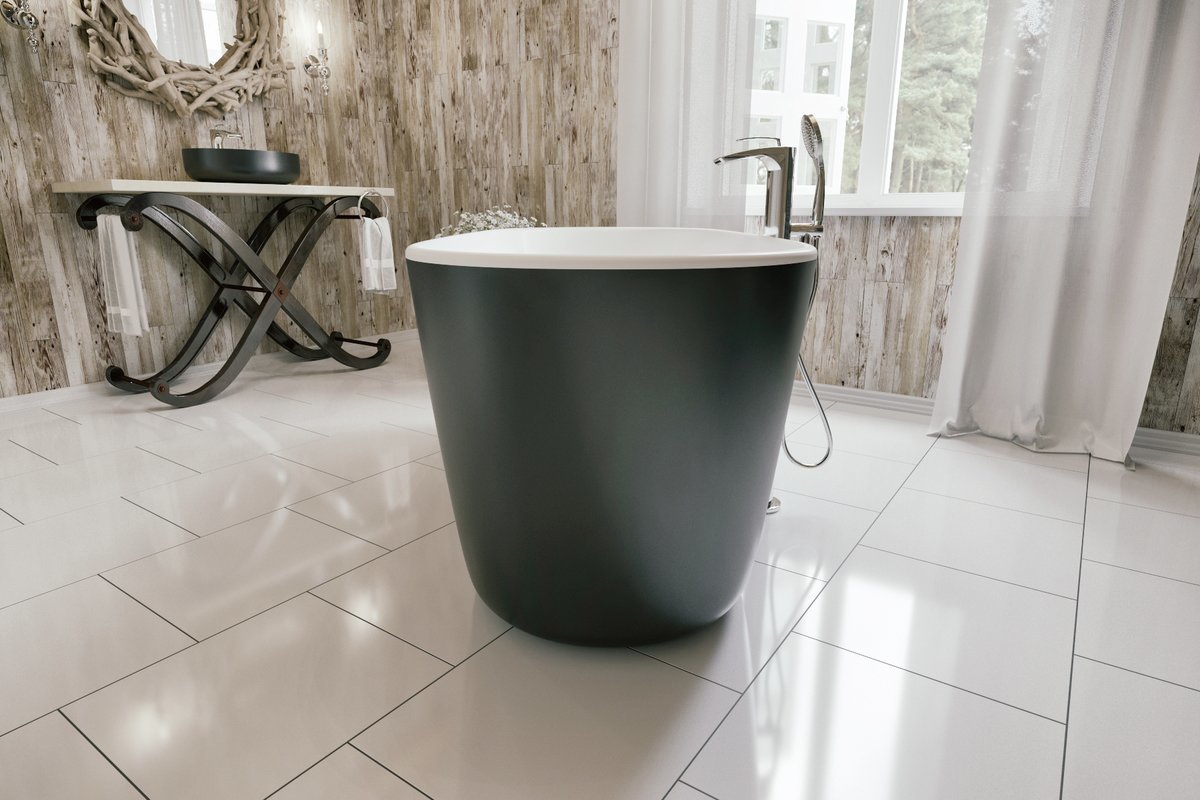 - Freestanding “mini-tub” designed for small bathrooms, condos, and urban spaces
