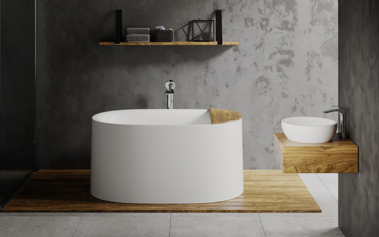 - Freestanding bathtub inspired by traditional Japanese soaking baths