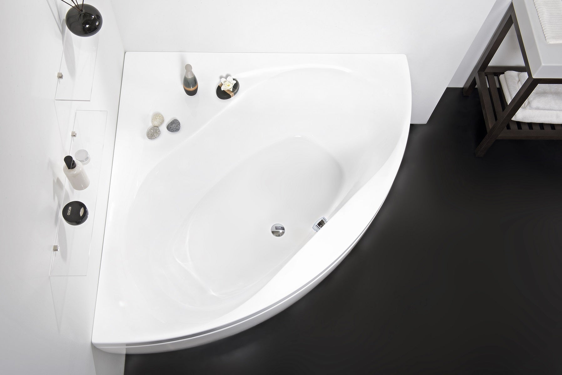 It includes a spacious corner shelf and a widened rim, designed to keep bath essentials conveniently within reach.