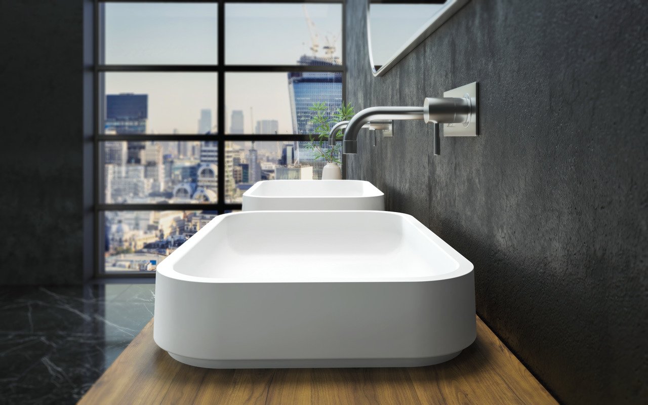 The sink is crafted from AquateX™, Aquatica’s proprietary solid surface material.