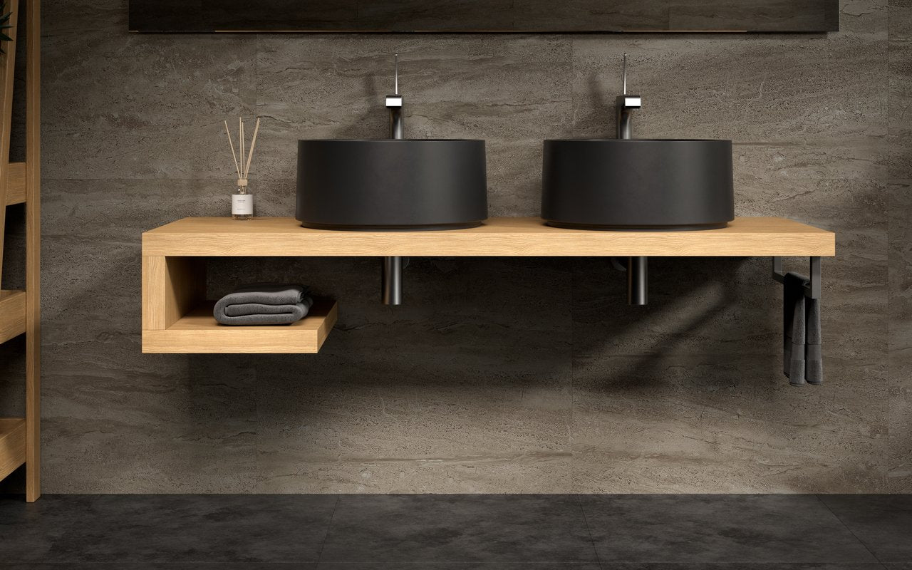 It is described as featuring a deep basin and elevated walls that create bold architectural presence, balanced by soft, fluid lines.