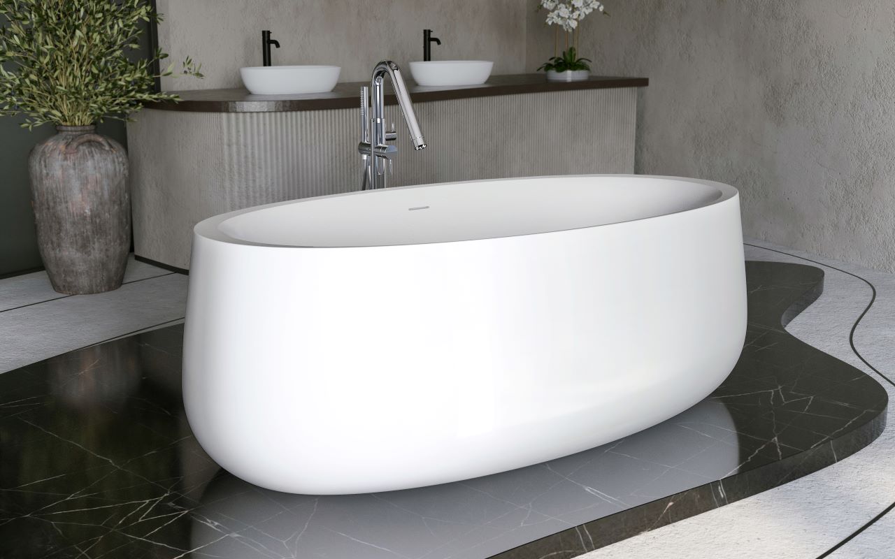 - Freestanding solid surface bathtub with organic, cocoon-inspired silhouette