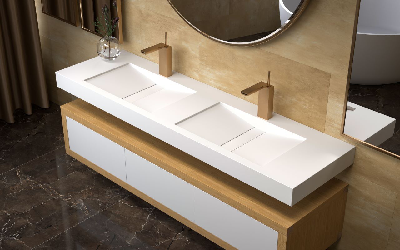 Its non-porous, hypoallergenic surface is described as supporting superior hygiene, easy maintenance, and long-lasting performance. Crafted from AquateX™ solid surface, it offers a velvety-smooth touch, with an optional AquateX™ LUX high-gloss finish available for additional visual sheen.